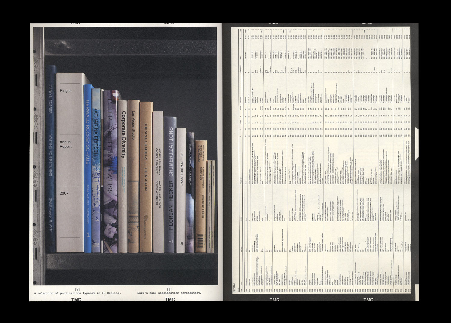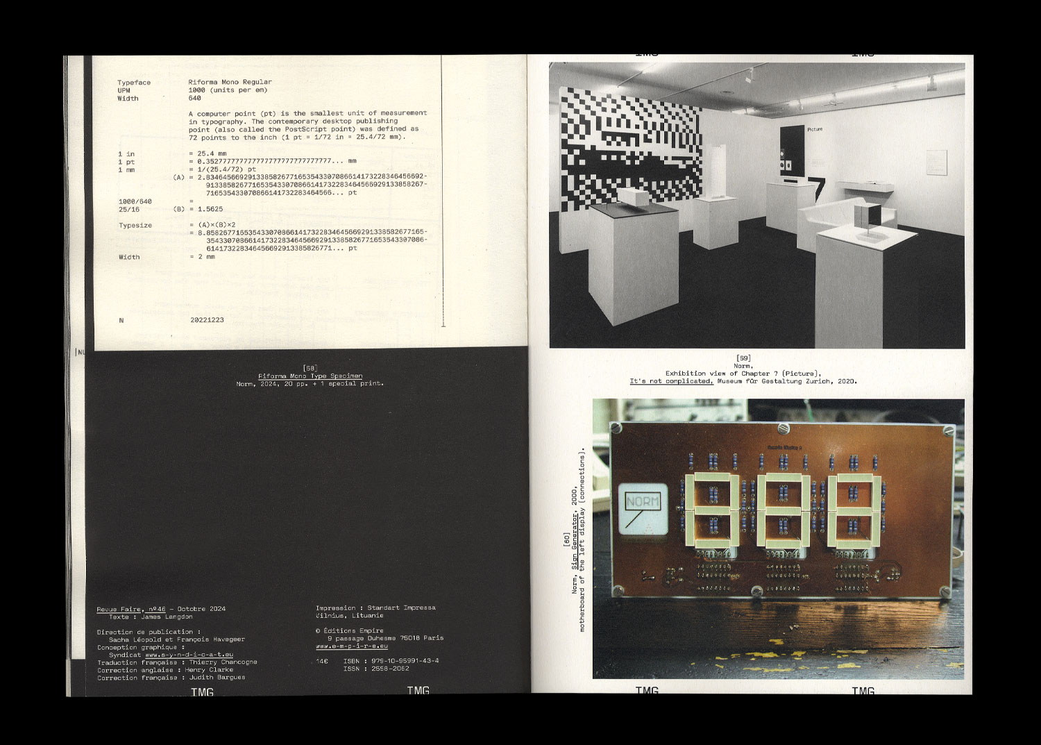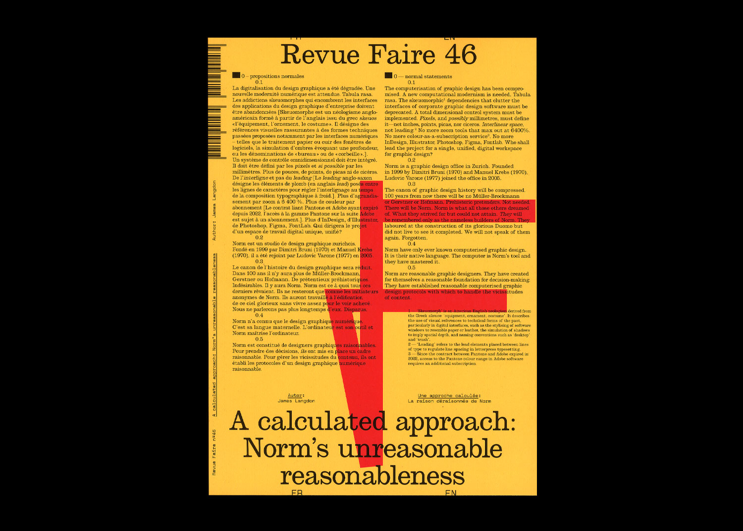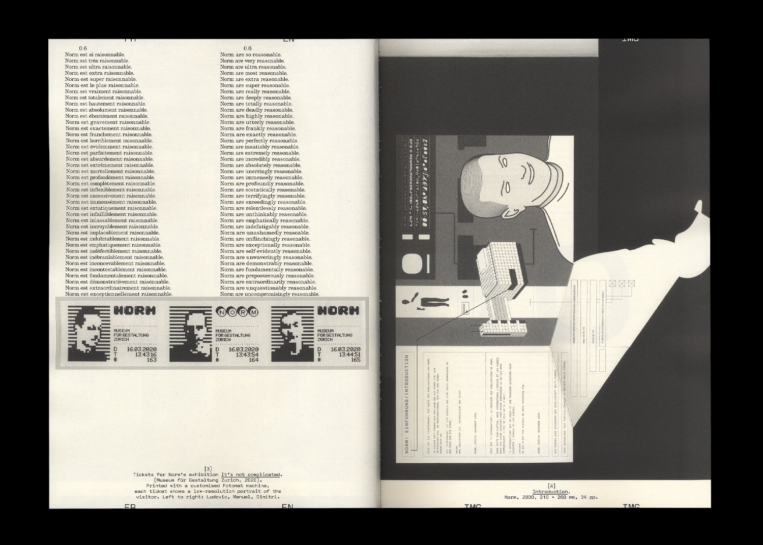 Norm est un studio de design graphique zurichois. Fondé en 1999 par Dimitri Bruni (1970) et Manuel Krebs (1970), il a été rejoint par Ludovic Varone (1977) en 2005. Norm n’a connu que le design graphique numérique. C’est sa langue maternelle. L’ordinateur est son outil et Norm maîtrise l’ordinateur. Dans 100 ans on ne connaitra plus Müller-Brockmann, Gerstner ou Hofmann. De prétentieux préhistoriques. Mais on connaitra Norm. Norm est ce à quoi tous ces derniers rêvaient. Ce qu’ils on cherché à atteindre sans jamais y parvenir. Ils ne resteront que comme les initiateurs anonymes de Norm. Ils auront travaillé à l’édification de ce ciel glorieux sans vivre assez pour le voir achevé. Nous ne parlerons pas plus longtemps d’eux. Disparus.