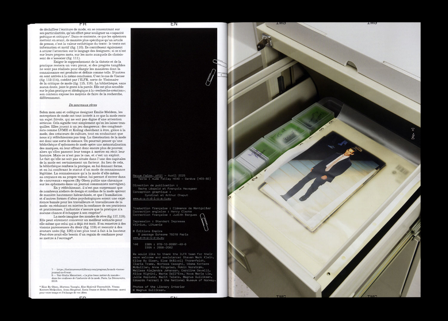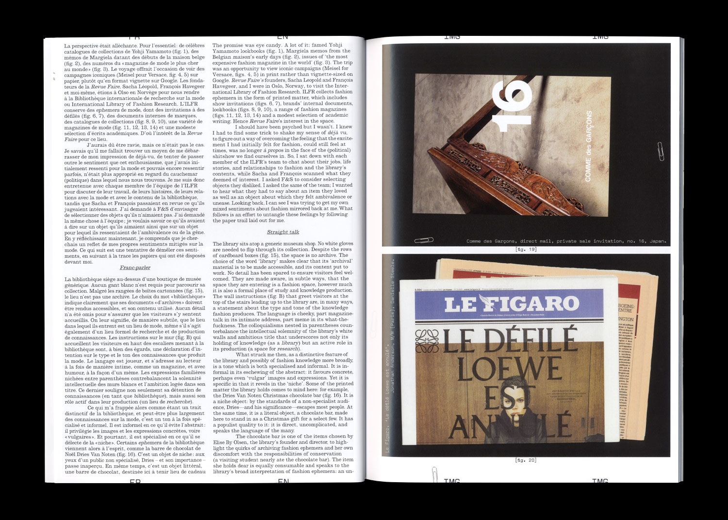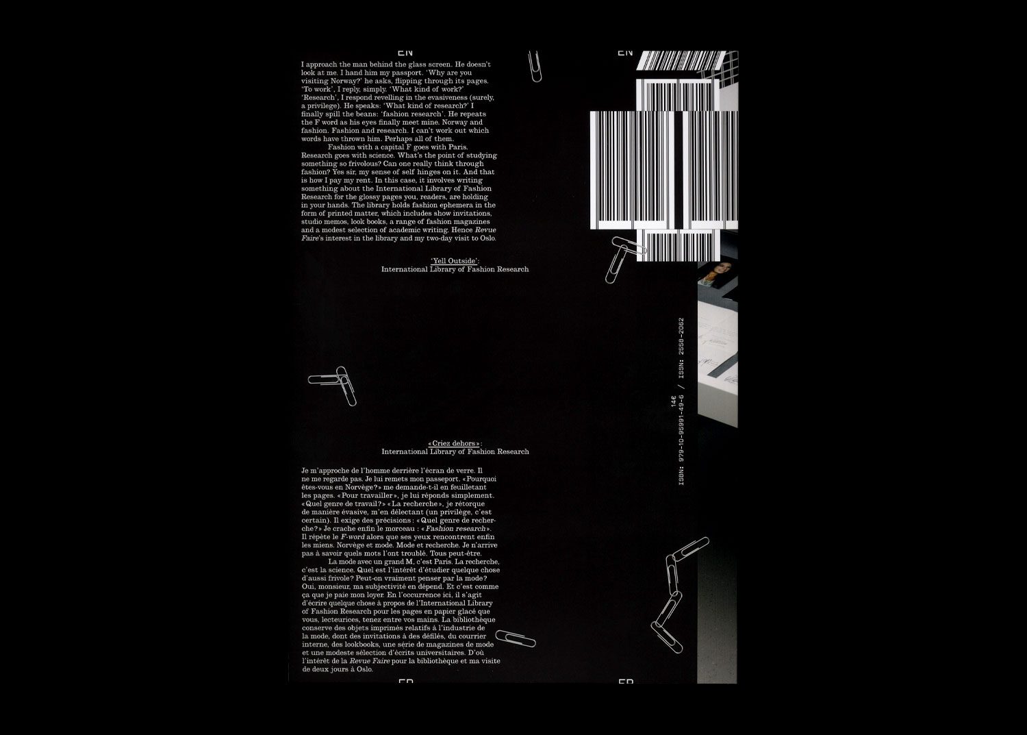Fashion with a capital M goes with Paris. Research, surely, with something like science. What’s the point of studying something so frivolous? Can one we really think through fashion? Yes sir, my sense of self hinges on it. And that is how I pay my rent. In this case, it involves writing something about the International Library of Fashion Research for the glossy pages you are holding in your hands. The library holds fashion ephemera, i.e. printed matter, which include show invitations, studio memos, look books, a range of fashion magazines and a modest selection of academic writing, among other things. Hence Revue Faire’s interest in the library, and my being in Oslo for two days.