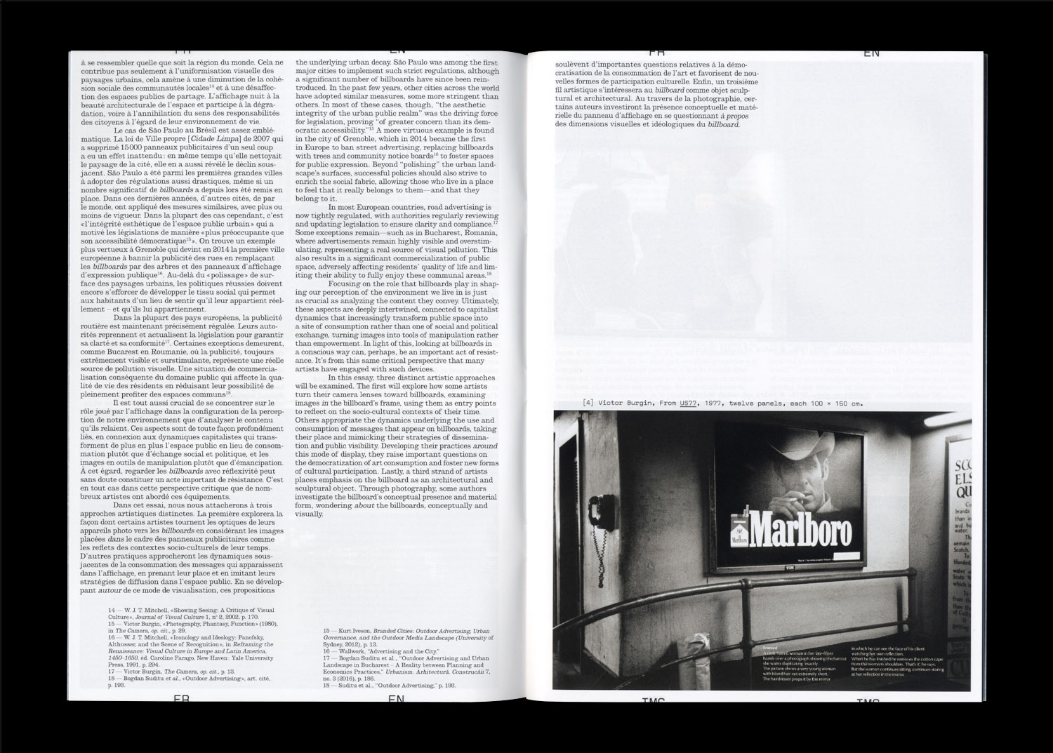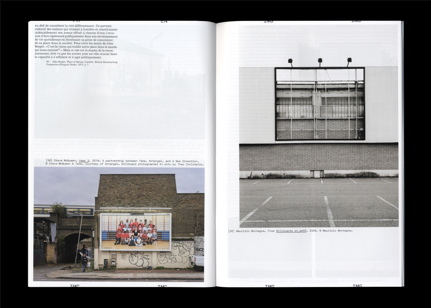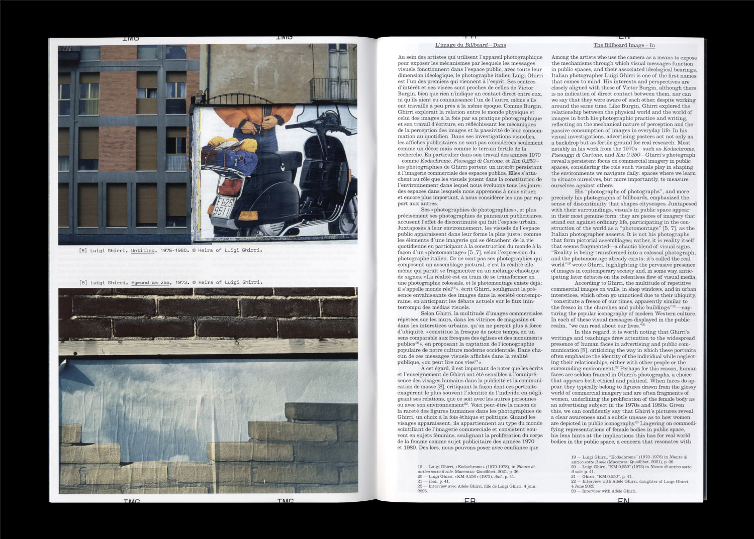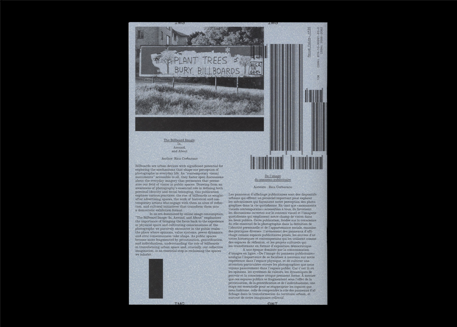 Billboards are urban devices with significant potential for exploring the mechanisms that shape our perception of photographs in everyday life. As ‘contemporary visual monuments’ accessible to all, they foster open discussions about the everyday imagery that permeates that permeates our field of vision in public spaces. Drawing from an awareness of photography’s essential role in defining both personal identity and social belonging, this publication explores various practices: the rise of billboards as sought-after advertising spaces, the work of historical and contemporary artists who engage with them as sites of reflection, and cultural initiatives that transform them into a democratic exhibition format.